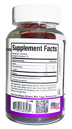 -. Feature : 5 mg of Melatonin per serving to support Natural Sleep. / Helps jet lag recovery, insomnia, and readjusting sleep patterns. / Made with natural Colors and Flavors for an awesome strawberry taste. / CONTAINS NO preservatives, gluten, milk, eggs, peanuts, tree nuts, shellfish or soy. / Is safe, non-habit forming, sleep aid supplement.