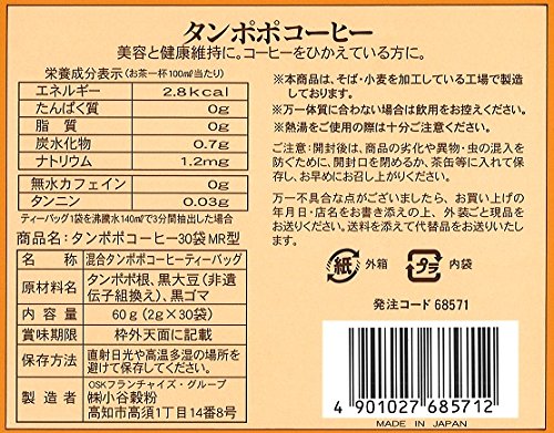 - 原材料:タンポポ根、黒豆(非遺伝子組み換え大豆)、黒ゴマ