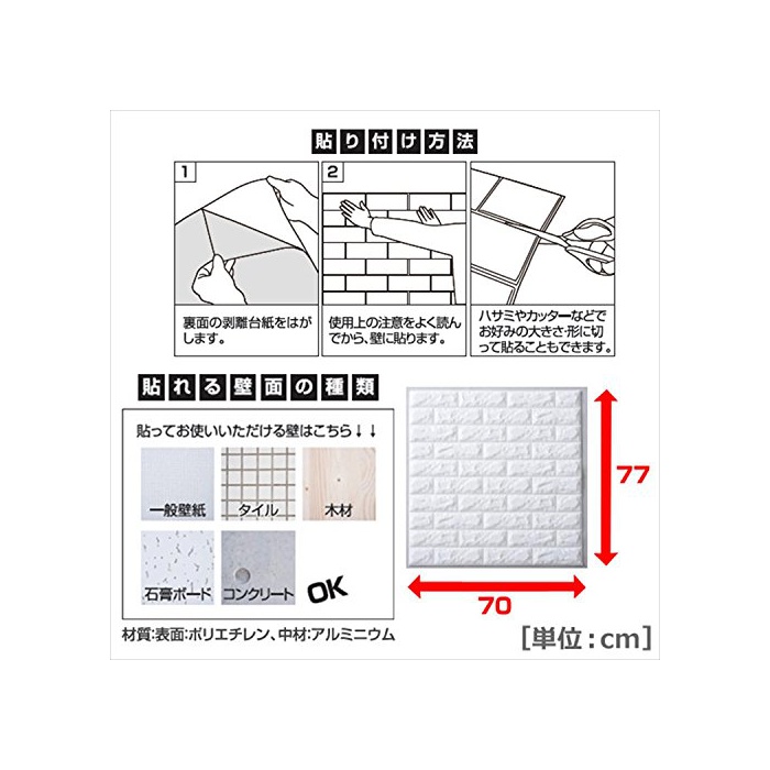 쿠션 타입의 brick 벽지입니다.씰 타입 (이므로)그래서 시공도 간단.가위나 커터에 좋아하는 크기로 컷 해 붙이는 것 뿐(만,만큼)!모자이크무늬의 디자인이므로,매우 멋쟁이!일반의 벽지는 물론,실크의 벽지,금속,유리,비닐,시멘트,목재로도 붙이기 가능합니다!가벼워 둥실둥실 하고 있으므로 단열 효과도 발군!쿠션 타입에 부드러운 때문에,어린이 방 등 위험이 어느(있는) 생활 공간에서,쿠션 가이드로서 안전하게 사용하는 것 를 할 수 있습니다.저렴한 가격이기 때문에,선물로도 추천입니다!