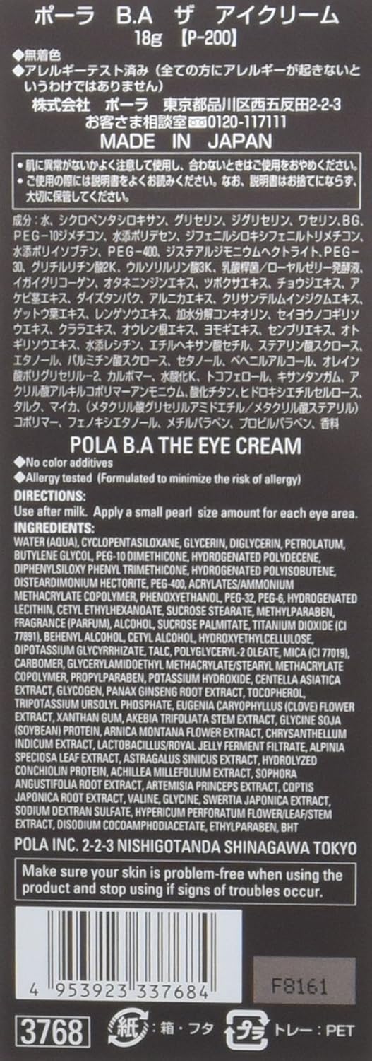 ~目もと特有のエイジングに。「強度コラーゲン」に着目した、目もと用クリーム。~ 見た目年齢を大きく左右する「目もと」。「目もと」の肌は薄く、内部構造がゆるみやすい状態です。この「目もとゆるみ」に着目し、X(クロス)型補強リフォーム発想で、ポーラオリジナル保湿成分「月桃葉BAリキッド」や「アケビ茎エキス」を配合。さらに糖化に着目した「EGクリアエキス」「YACエキス」も配合し、くっきり、 明るく冴えた目もと印象へ。内 容 量 : 18g型 番 : 3768