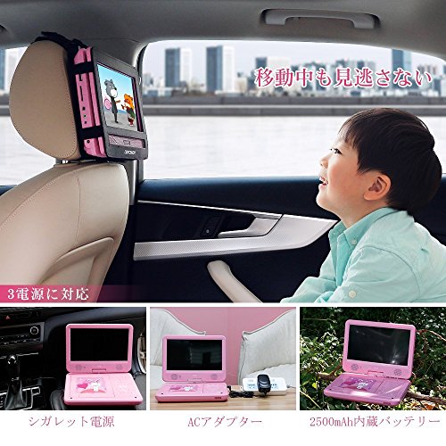 ACアダプター、車載用シガーソケット電源アダプター、2500mAh大容量内蔵電池の3電源に対応しているので、屋内はもちろん、屋外、車や新幹線の中など、どこでも手軽にDVDを見ることができます。