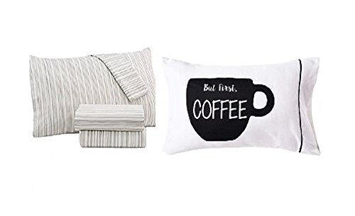 - Set includes 1 Flat Sheet, 1 Fitted Sheet, 1 Standard Pillowcase + Additional Printed Pillowcase "But First, Coffee"