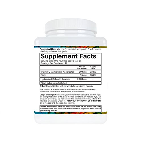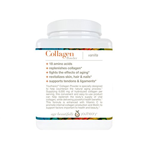 Youtheory Collagen Powder is specially designed to help counteract the natural aging process. Supplying six (6) grams of hydrolyzed collagen per serving, this convenient and easy-to-use product can help replenish the body's supply of vital collagen, while delivering powerful health benefits. This formula is enhanced with Vitamin C to promote internal collagen production and Biotin to support factors important to health and beautyFeature