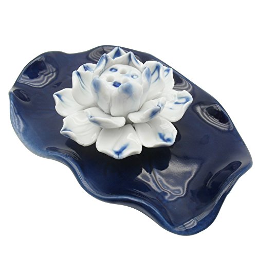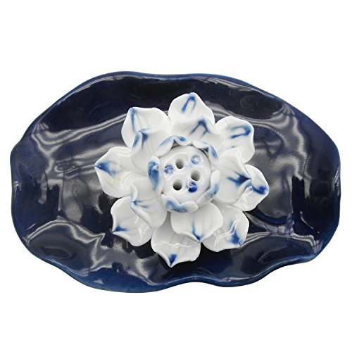 TrendBox Deep Blue Ceramic Handmade Oval Lotus Leaf Artistic Incense Holder Burner Stick Coil Oil Diffuser Ash Catcher Buddhist Water Lily Plate Three Holes