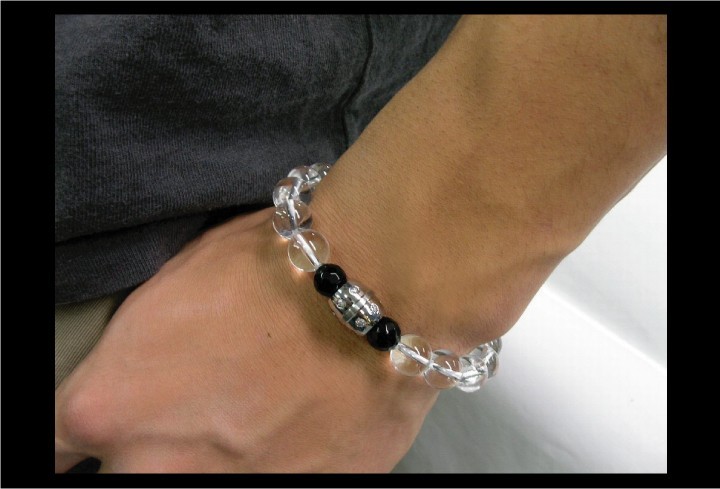 オリジナルデザイン!バレルデザインのトップにジルコニアが埋め込まれています。輝きを失わないステンレストップ。細かく六角形にカットされたパワーストーンは乱反射により輝いております。【トップ素材】 ステンレス【天然石素材】10ミリ玉 ・ブラックオニキス ・クリスタル(水 晶)【サイズ】 フリーサイズ(約20cm) ※PUゴムで連結されていますので伸縮自由 フリーサイズ