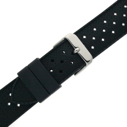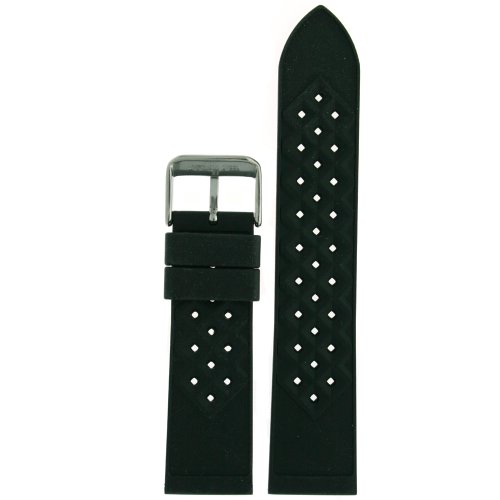 -. Feature : 20mm Silicone Rubber Watch Band Black with Heavy Stainless Steel Buckle / Strap Features Hole Textured Design To Help Prevent Perspiration Under Band / Band Length: Buckle Side: 3 1/4" Including Buckle and Hole Side: 4 3/4". Band Thickness 3mm / Waterproof Replacement Strap is Ideal for Divers or Sport Watches / Stainless Steel SP.R.Ing Bars Included