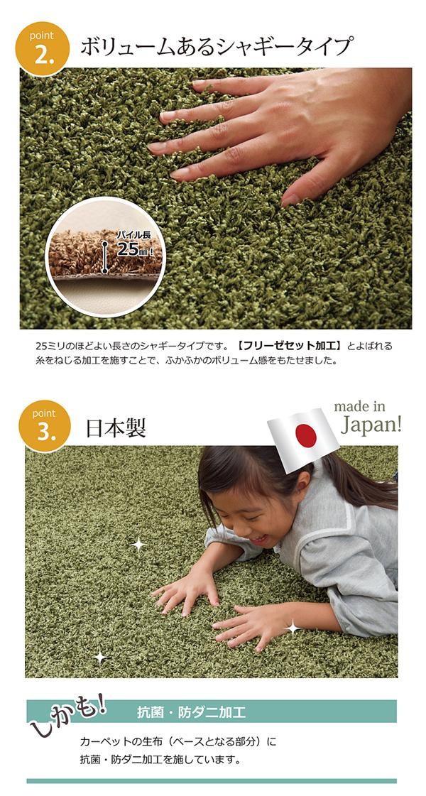 | 日本製のタフトシャギーラグです。ホットカーペット、床暖房対応で、パイル部分はさらっとしていますのでべとつかず暑い時期にもご使用頂ける、オールシーズン仕様です。 |