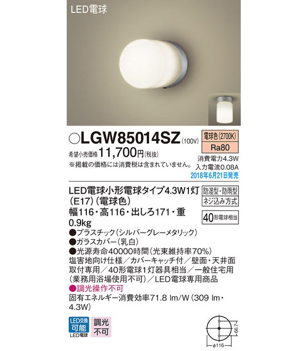 ●光源:LED電球小形電球タイプ4.3W1灯(E17)(電球色)、色温度:2700K、光源寿命40000時間(光束維持率70%)