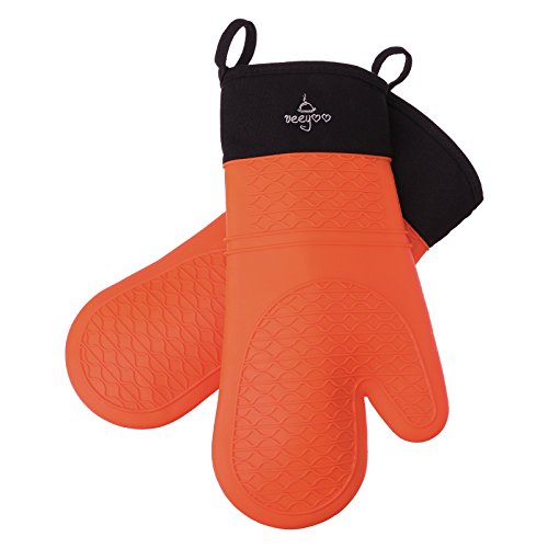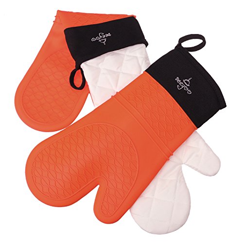 VEEYOO Silicone Oven Mitts Extra Long Professional Heat Resistant Kitchen Cooking Oven Gloves with Quilted Liner, Set of 2 Orange