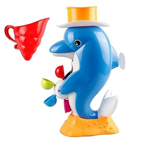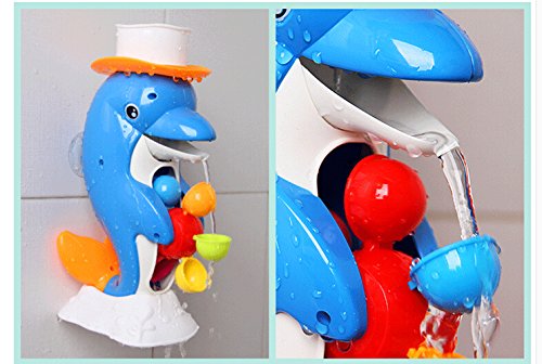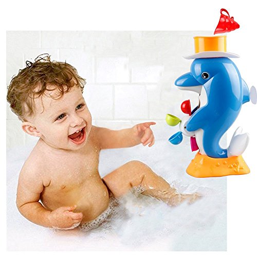 -. Feature : Dolphin surP.R.Isingly opens his mouth and spits out a small amount of the water. As the water flows out, the colorful wheel in the Dolphin's belly rotates. The Dolphin closes his Mouth, and After another few seconds, the Dolphin will randomly spit out more water, and the fun begins again, and the excitement repeats! / Enjoy Bath Time and Learning Toy:It's a cool science enrichment bath toy for kids 1 year old and above. It promotes sensory development and introduces your kids to the concept of cause and effect. It also helps in developing their hand-eye coordination and fine motor skills. .Promote hand-eye coordination and improve the sensory ability.With its unique design, the Duck Bath Toy makes the movement unexpected, so children get really excited by the experience!! / Water is Drawn Up and Through the Spout Creating an Endless Stream Through Three Interchangeable Tumblers.It will slow the stream for your child to Observe it well. / This bath toy requires no batteries, and mounts securely on the tiled wall or tub with 2 suction cups. Suction cups adhere only on smooth, glossy non-porous surfaces such as larger tile, glass, fiberglass / Safe & Fun for Kids Aged 1 to 6 - Our duck bath toy is made out of durable nontoxic plastic and includes no sharp edges that can cause injury.