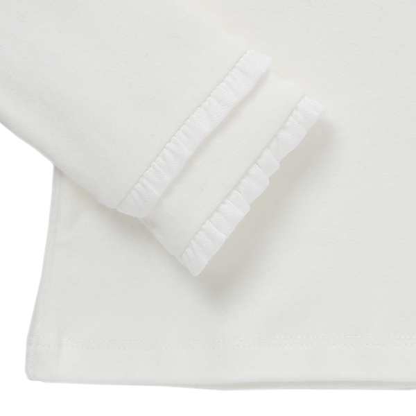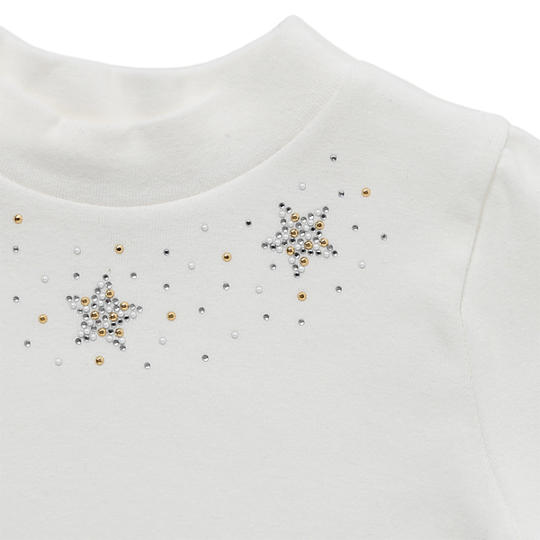 상품설명 아이보리 별티셔츠입니다. 네크라인엔 별 진주 핫피스가 흩뿌려져 있어서 블링블링한 매력을 느낄수 있습니다. 소매 밑단쪽 프릴 2단 디테일이 사랑스럽습니다.