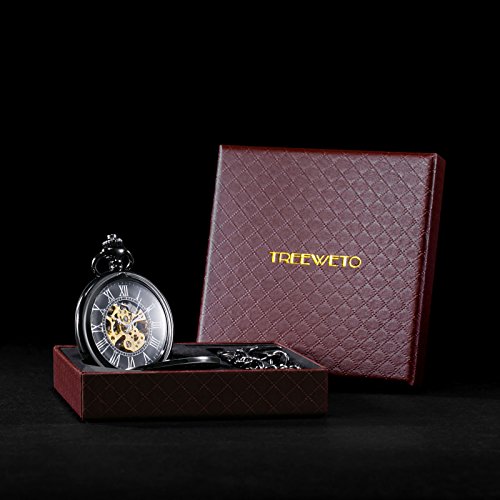 -. Feature : Classic half hunter pocket watch with roman numarals double open cover,Skeleton White Dial, Renaissance Antique Style, Looks very Elegant, Smart, Vintage and fashionable! / Precise jewel mechanical movement,means flawless attention to time.17-jewel mechanical hand-wound movement with an eye-catching skeleton dial and roman numerals,looks retro and elegant. / Power this watch by manually winding the crown, which tightens the mainsP.R.Ing and stores energy in order to keep the movement running smoothly. Estimated power reserve for this movement is 24 hours, hand wind the watch daily to maintain accuracy. / This pocket watch includes a 14 inch steel curb chain that can attach to your belt loop, and come with unique TREEWETO brand gift box. / Perfect gift for your love and family or yourself, Best Valentine Gift, Superb Christmas Gift, Birthday Gift, Wedding Gift etc. For the working environment which is not allowed to wear wrist watch, like chef or nurse.