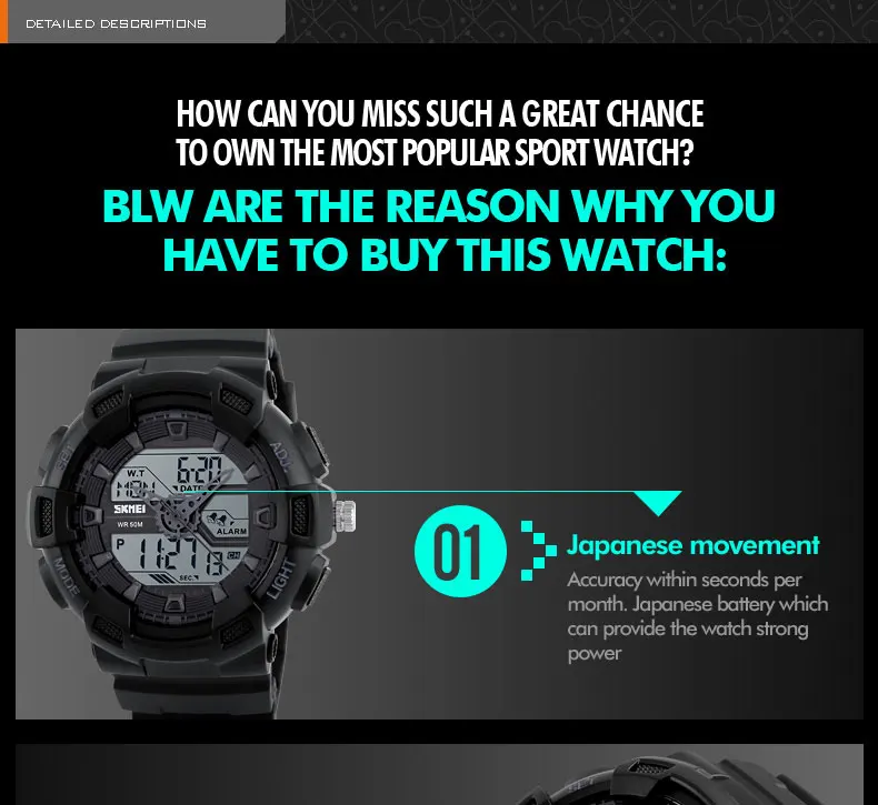 Feature:Complete Calendar,Shock Resistant,Water Resistant,Back Light,LED display,Alarm