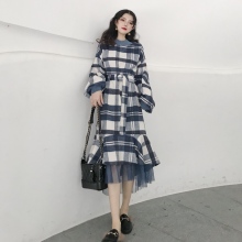 时尚裙子秋女2018新款宽松毛呢拼接网纱复古格子鱼尾中长款连衣裙