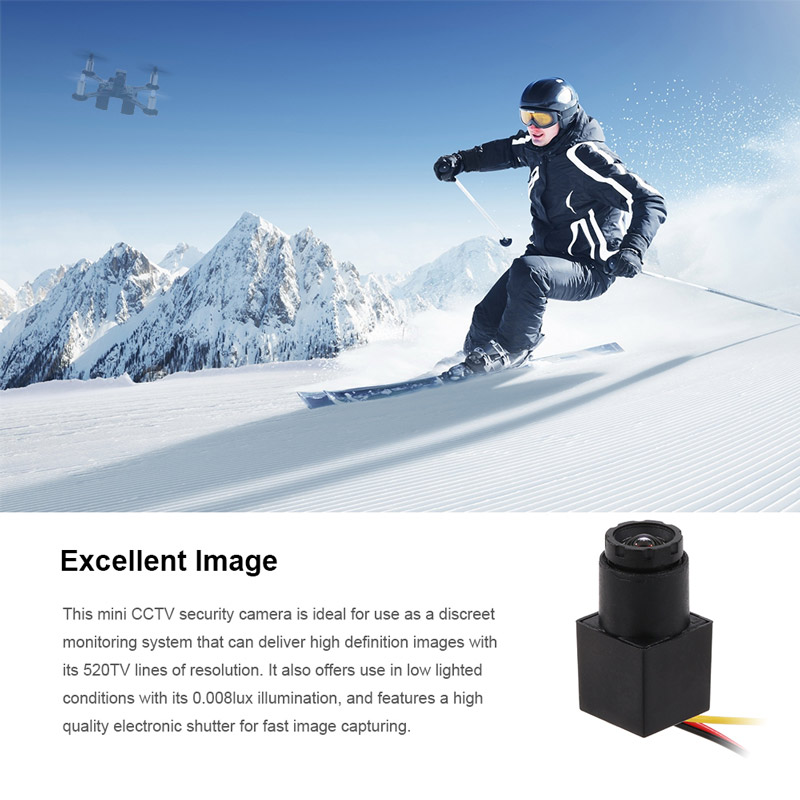 When camera meets drone, a walking movie is switched on. The flying drone takes the camera to capture the view that the camera never saw on the ground. With an ultra-small and compact design, this mini CCTV 520TVL camera is ideal for useas a discreet monitoring system that can deliver high definition images with its 520TV lines of resolution. It also offers use in low lighted conditions with its 0.008lux illumination, and features a high quality electronic shutter for fast image capturing.A wonderful part for RC racing drone! What are you waiting for?
