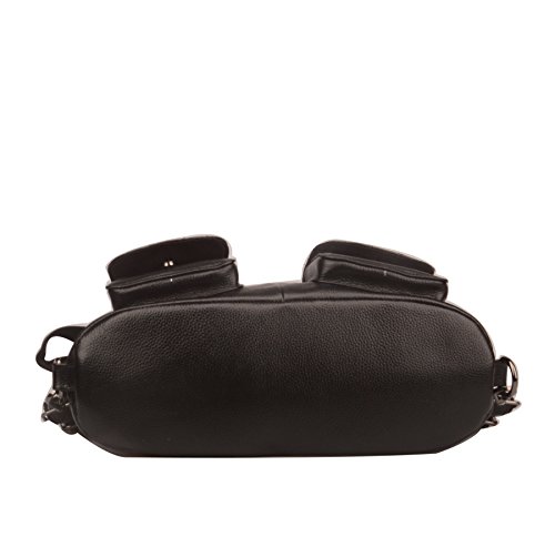 -. Feature : Full grain cow leather / Fabric lining / Adjustable double shoulder straps. Three pockets outside, four pockets inside / 13.8'' (L) , 5.1'' (W) , 11'' (H) / Since leather material is very soft, some wrinkles may on the surface of the handbag, that is not quality problem.