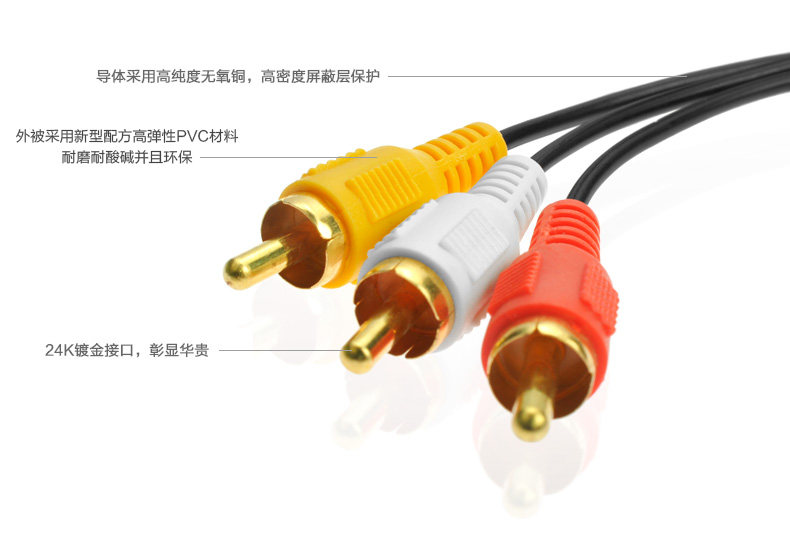 达而稳一分三莲花音频线采用无氧铜(OFC)导体、进口段子、塑胶等材料制造,高屏蔽保真设计,抗干扰性能强,传输信号效果佳,线缆采用75欧姆变准同轴电缆,线芯采用低电容的物理发泡PE的内绝缘层及高纯度导体,有效避免视听环境中各种信号的干扰。