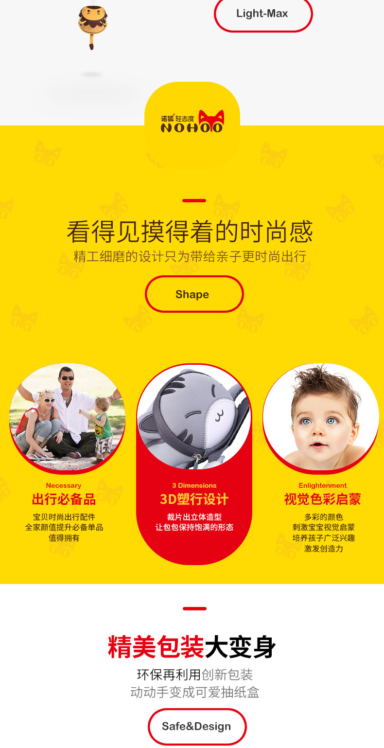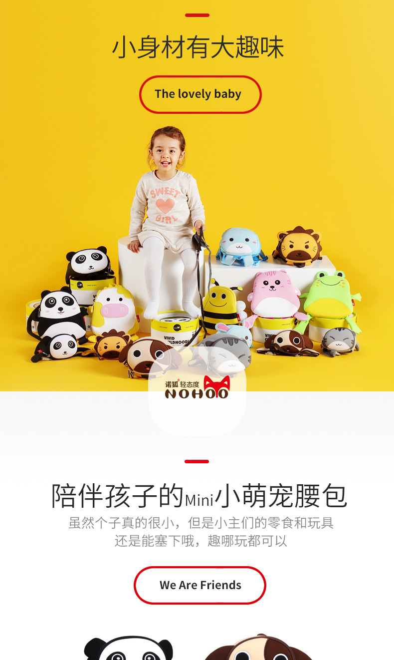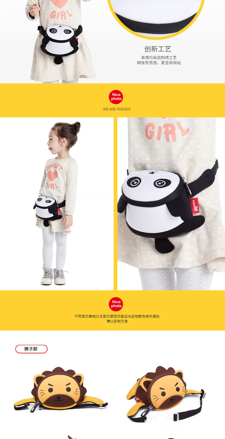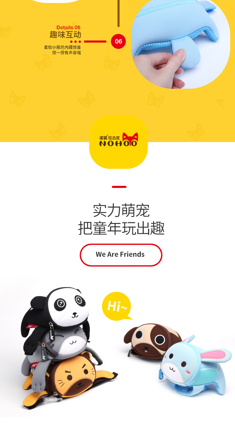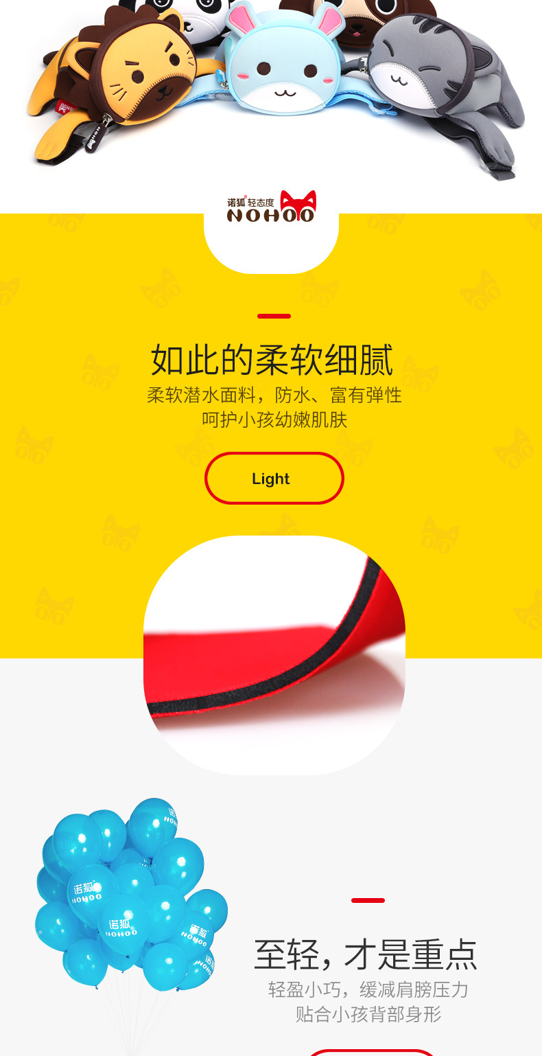 诺狐采用独特的Neoprene潜水料,有别于一般材质,潜水料具有良好的柔软性与弹性,防水防潮,质地轻盈等特点,有适用于专业潜水衣及各种运动领域,其立体塑形极具个性的特性更风靡时尚圈。诺狐童包独特的设计与良好的材质有别于一般的儿童包,立体结构剪裁,鲜艳大胆的配色,打材料的特性发挥到淋漓尽致,为我们的用户提供缤纷、舒适、健康的产品体验。