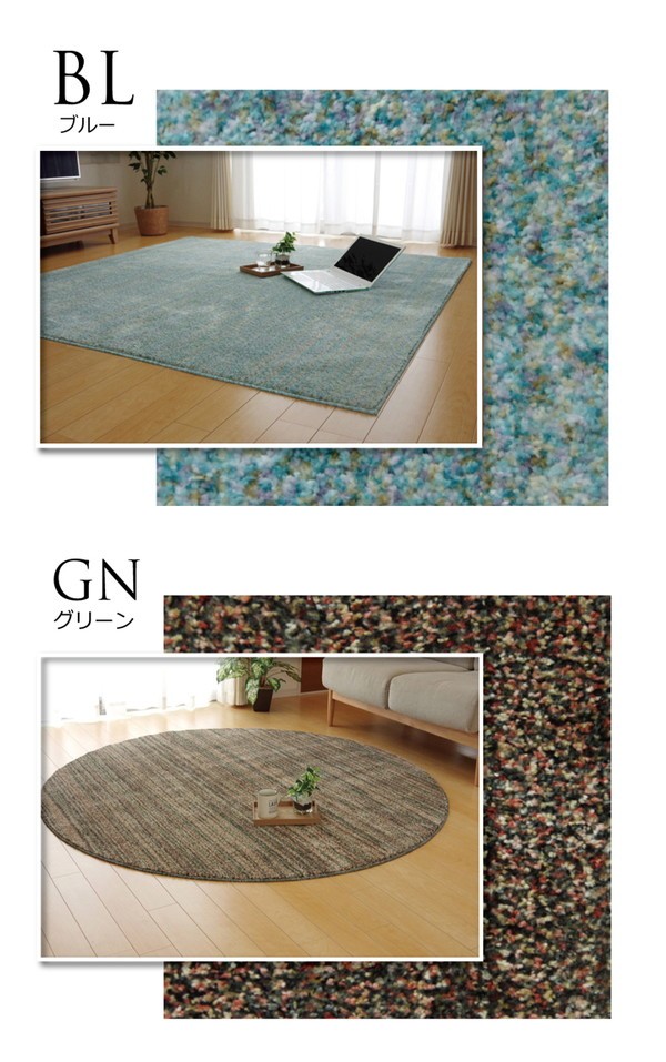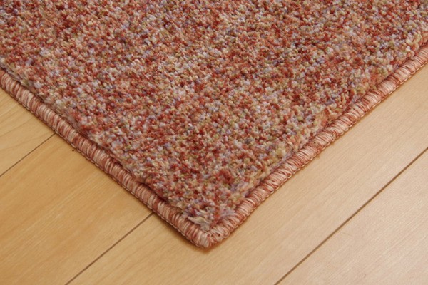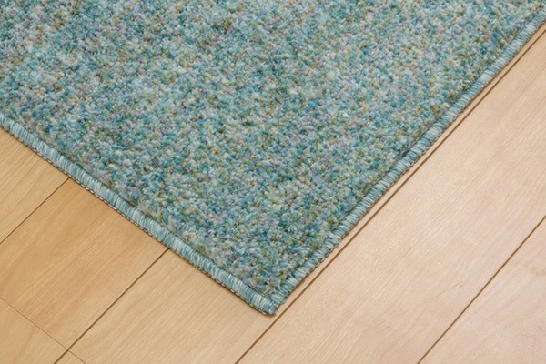 安心の日本製ふんわり多色MIXタフトラグです。多色多サイズ展開、お部屋に合わせてお選び下さい。基布には抗菌・防臭・防ダニ加工を施しておりますので、お子様にも安心です。パイル長約15mm、目付は1平方メートルあたり840gのボリュームタイプです。触っても基布が見えないくらいのふかふか、モコモコのボリュームを実感して下さい。パイル部分はレベルカット加工(表面をフラットにする加工)を施しておりますので、ふんわり柔らかい肌触りです。ホットカーペット、床暖房対応にも対応しています。