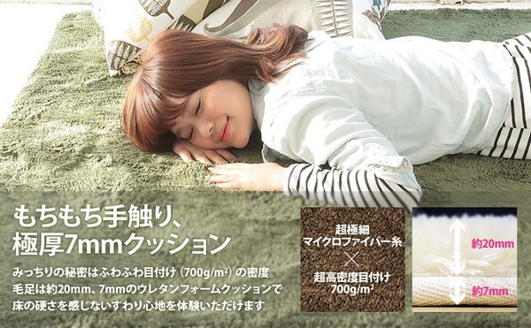 毛足は約20mm、7mmのウレタンフォームクッションで床の硬さを感じないすわり心地を体験いただけます。