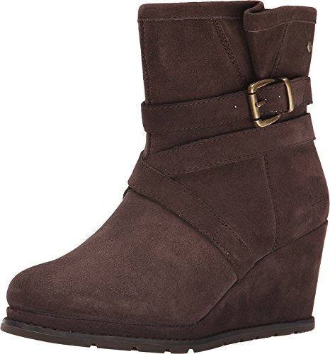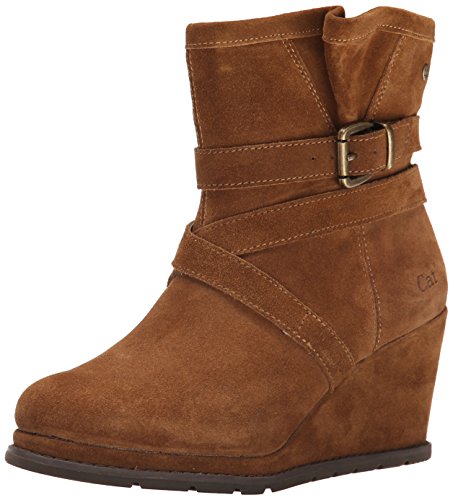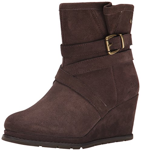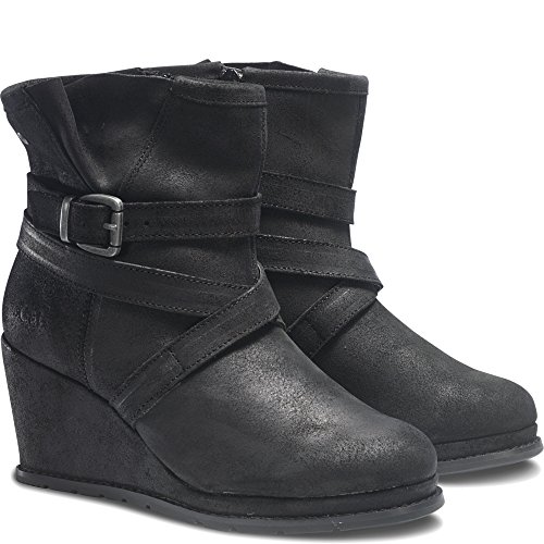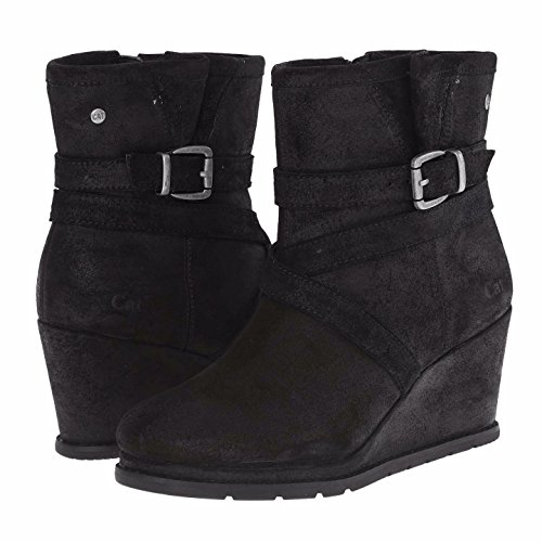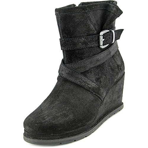 An inventive wedge boot in a mix of sleek suede and wrap around buckle accents offers a comfortable, yet elevated style. This tough chick could use some patterned leggings or distressed and patchy denim to complete the look.
