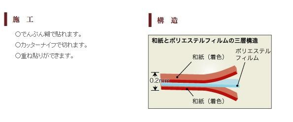 和紙本来の特性である吸放湿性、吸着性、断熱性を備えながら、破れない強度とでんぷん糊で貼れる特長を併せ持つ「人と建具にやさしい」素材。彩りのカラーで住まいをおしゃれに演出できます。 |