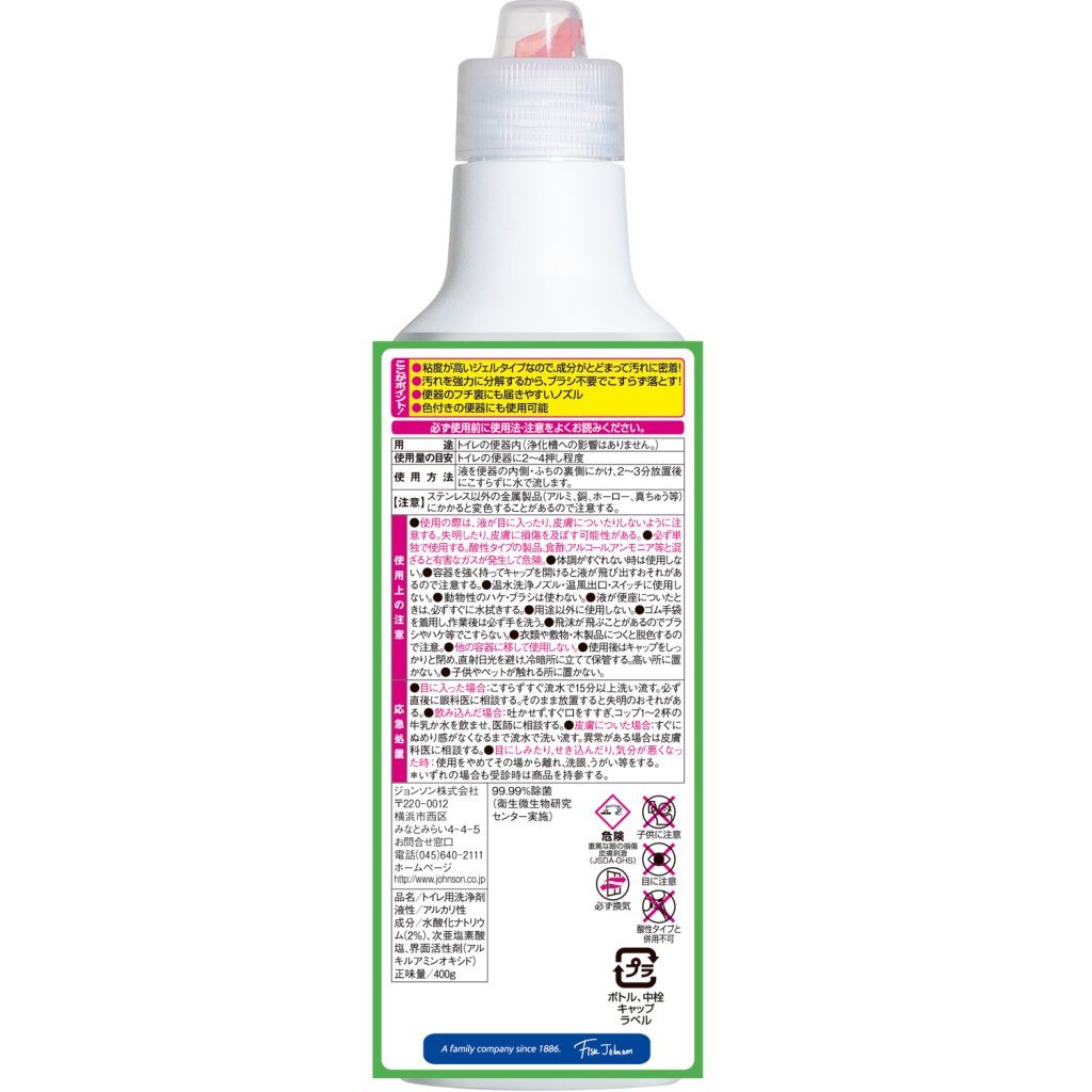 商品サイズ (幅×奥行×高さ) :66×55×241mm内容量:400g●粘度が高いジェルタイプなので、成分がとどまって汚れに密着! ●汚れを強力に分解するから、ブラシ不要でこすらず落とす! ●便器のフチ裏にも届きやすいノズル●色付きの便器にも使用可能