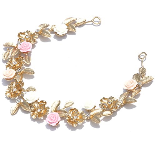 This headpiece of ceramic flowers and golden metal leaves is the perfect gold accent for a rustic wedding. The bridal headband has loops at the back to pin into your hair. This would be beautiful for a bride on her wedding day, or to wear for your engagement photo shoot. It would also be beautiful for a bridesmaid or flower girl to wear.Feature