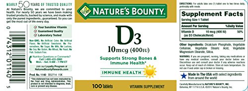 ReleaseDate : 2013-07-30 Studio : Nature's Bounty Publisher : Nature's Bounty Binding : Health and Beauty Product Description Nature's Bounty Vitamin D3 - the "Sunshine Vitamin" is an essential nutrient that the body creates by converting cholesterol in the body via sunshine. However, today's culture of cubicles, sunscreen, and near-round-the-clock indoor living minimizes our exposure to natural sunlight for the needed period of time for Vitamin D3 to form. Supplementing with Nature's Bounty Vitamin D3 is an easy way to increase your daily intake of this important nutrient. 0