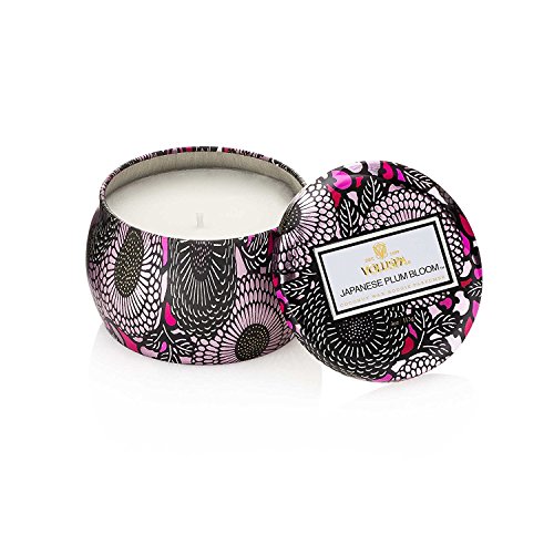 Studio : Voluspa Publisher : Voluspa Binding : Office Product Product Description luxurious mini-tin candle comes in a decorative metal tin that makes a beautiful d?cor accent. This new scent, Japanese Plum Bloom, is a fragrant mix of floral and fruit with notes of plum bloom petals leaves, ripe plum fruit and crushed currants. Filled with fragrant and clean-burning coconut wax. Made with no phthalates, no parabens, no sulfates and no animal testing. Burn time: 25 hours. 4 oz. 0