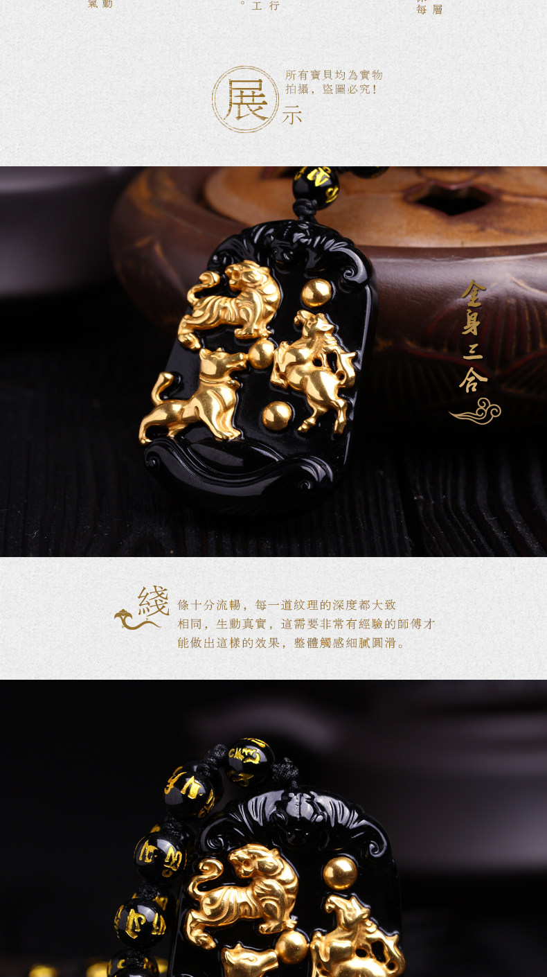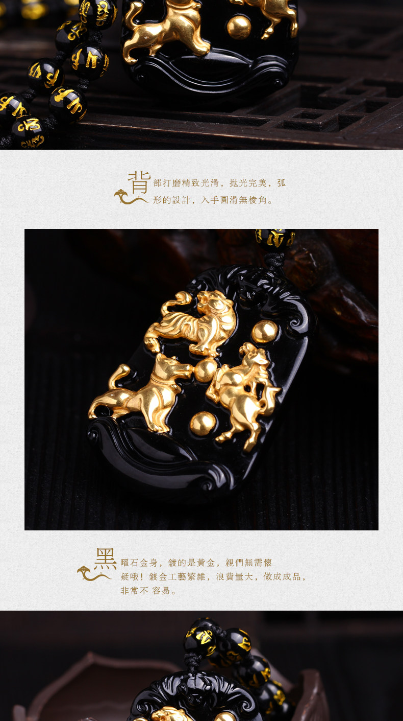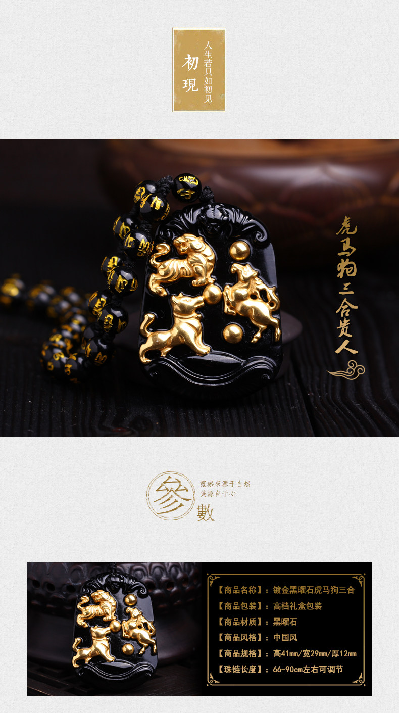 开光天然黑曜石秘法寅午戌三合贵神吊坠镀黄金属虎马狗项链开运物