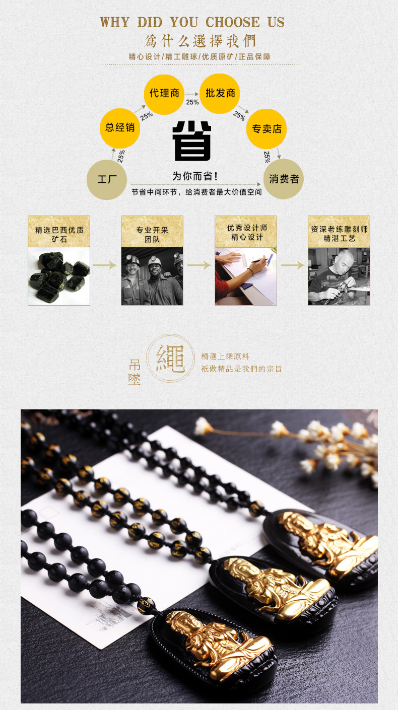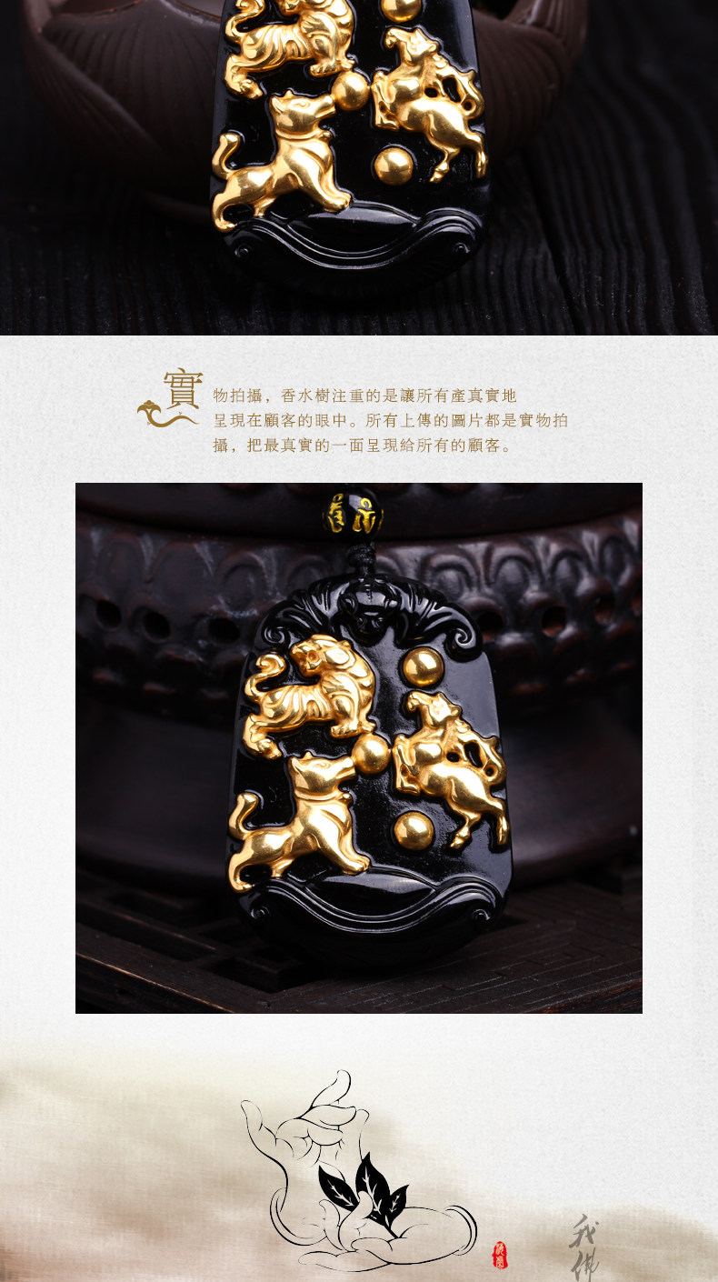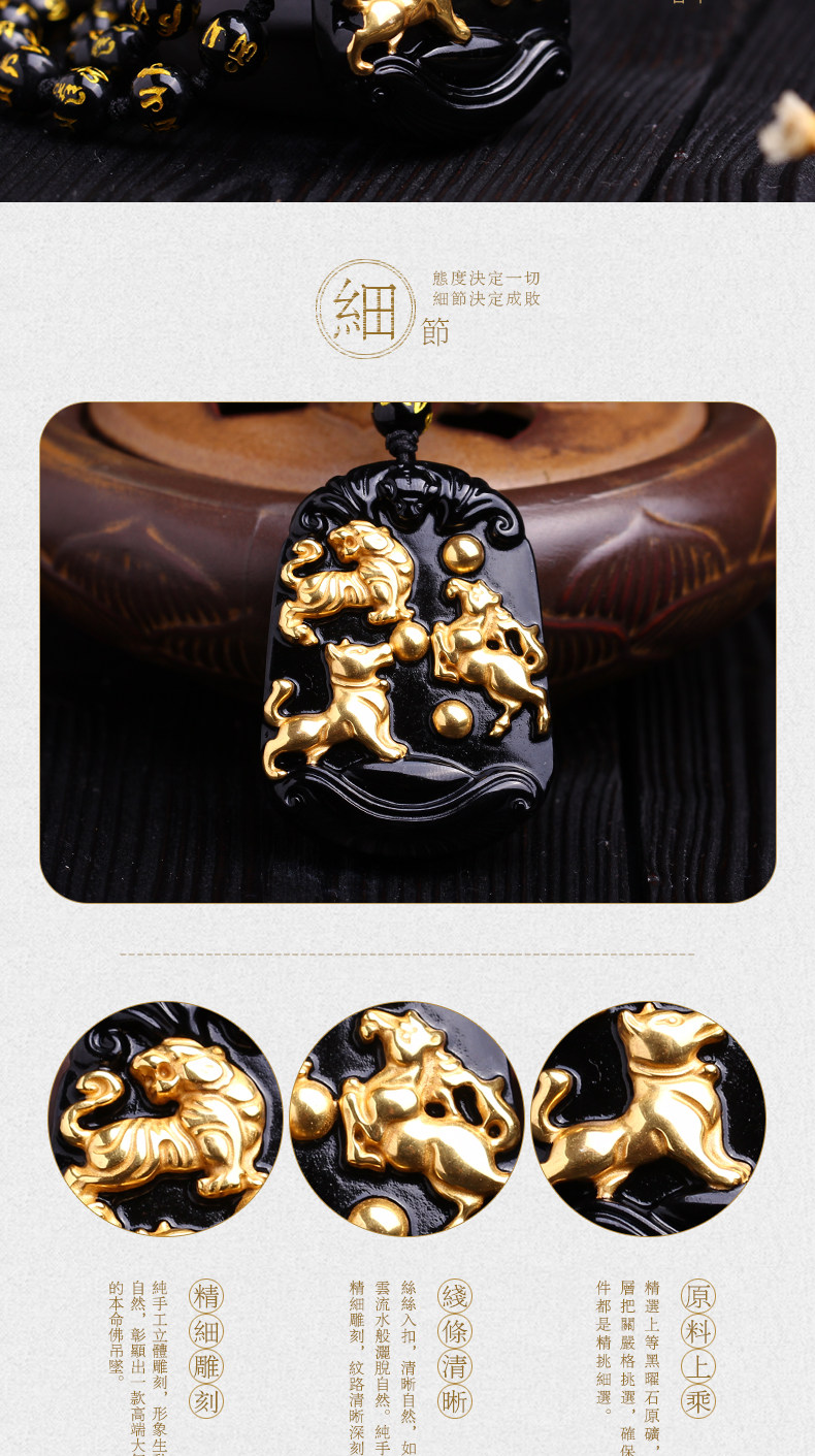 开光天然黑曜石秘法寅午戌三合贵神吊坠镀黄金属虎马狗项链开运物