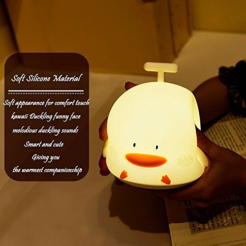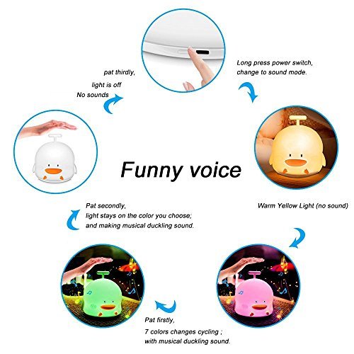 Specification: Item: Duckling Sound Night Light Material: Silicone + ABS Power: 1W Input: 5V/1000mAh Battery: 1200mAH Lithium Item Weight: 225g Item Dimension: 13.5 x 12.5 x 14 CM Cycling Color: Blue, Red, Green, Purple, Azure, Bright Yellow, Warm Yellow instructions 1. Before using it, please fully charged it. When charging it, the charging indicator light will flash. When it is full of power, indicator light will stay on red. Warm yellow light can use about 20 hours. Color change light can use about 15 hours. 2. When turn on the light, default mode is silent mode, please choose the light state according to personal preference. (1) By short pressing switch, it's silent mode: warm yellow color is on. Pat firstly, light color gradually changes every 3 seconds; Pat secondly, light stays on the color you choose; pat it the third time, light is off; circulation. (2) Long press power switch, change to sound mode: warm yellow color is on. The circulation is just like the silent mode, the different is adding the duckling sound effect from the cycling of the colors. 3. When the light is turned off by patting, there is quiescent current. If do not use it for long time, please turn it off by power switch. 4. After fully charged, please cut off the power in time, which is good for battery lifespan. Package includes: 1 x Duckling Sound Silicone Night Light 1 x USB Cable 1 x User Manual Welcome to our store, May you have a pleasant shopping experience! Our products have been well tested, examined and packaged before sending off. Any problem please feel free to contact us first so that we can supply the best service for you.Feature