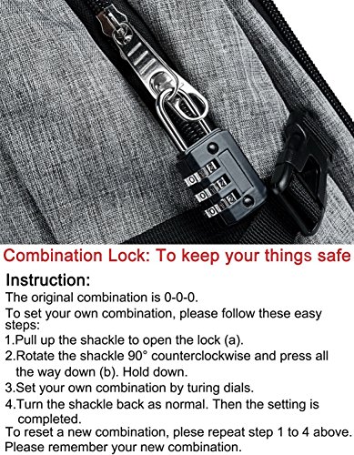 Travelambo is commited to provide consumers top quality products. This travelambo laptop backpack comes with lots of practical features: 1.Convenient USB charging port: You can charge your electronic devices whenever you want, without finding your powerbank inside your backpack. 2.Safe laptop compartment: With soft buffer area, you can keep your laptop(less than 17 inches) or other devices in this compartment safely. 3.Separted compartments: Designed with 10 separted compartments, you can keep your things neatly in this backpack, such as keys, earphone, wallet, etc. 4.Reinforced zipper: We choose high quality zipper component to ensure our backpack can last longer and provide consumers a better using experience. 5.Sturdy stitching: In order to avoid being unstitched, We apply stronger stitches on important parts of backpacks. 6.Waterproof material: With high quality waterproof material, you can keep your devices and documents from getting wet. 7.Combination lock and instruction: You will also receive a combination lock and an instruction when buy our backpacks. The lock can keep your property safer and the instruction will help you know our backpack quickly. 0 |