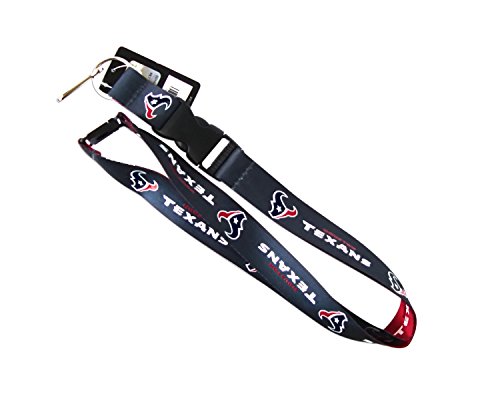 -. Feature : Houston Texans logo. Materials: Metal detachable clip, nylon, plasticsome thin cheap Lanyard. / Blue with Houston Texans logo on each side. / Extra thick band with raised lettering. / No velcro or safety clip. / Dimensions: 23 inches long x 1 inch wide.