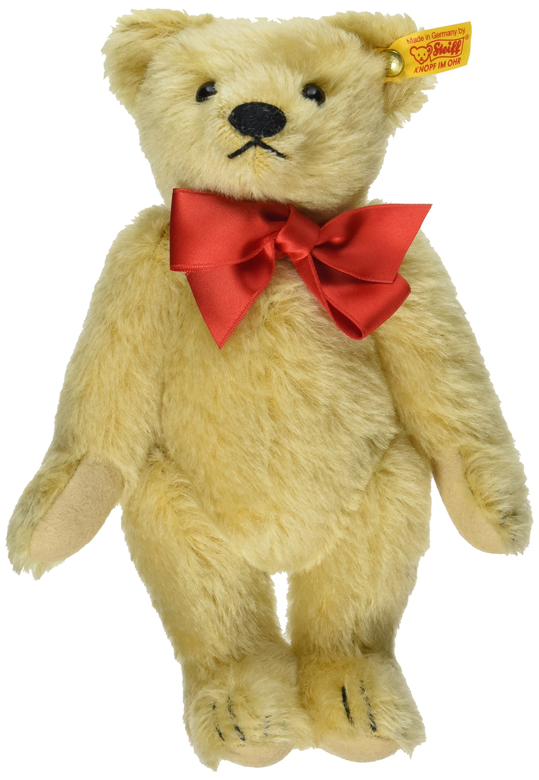 Using only selected materials, the left ear of the teddy bear, which is crafted by hand craftsmen, is tagged with "Button in Year" (trademark of Steiff).