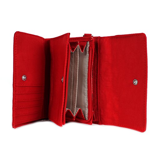 Feature : 100% Nylon / Adjustable flap snap closure, full length slip pocket on the back / Zipped pocket in the middle, inside with 3 slip pockets 8 credit card slots and 2 multifunction pocket / 2 full length billfold compartment / 5 3/4 (L)'' x 4 (H)''