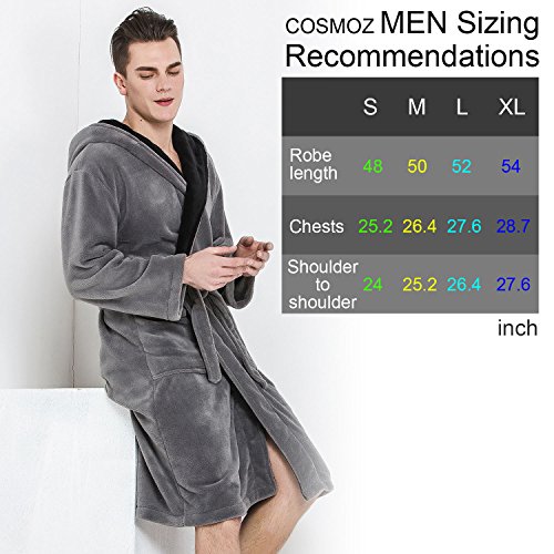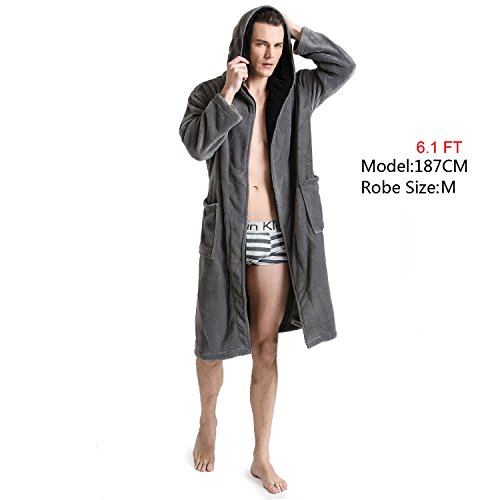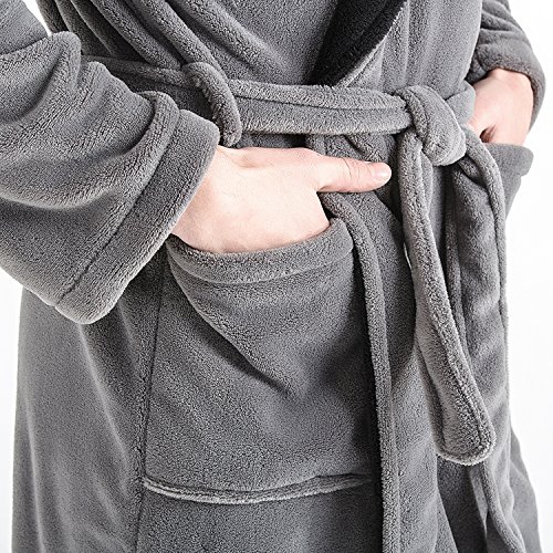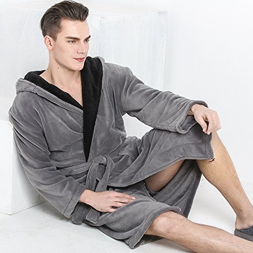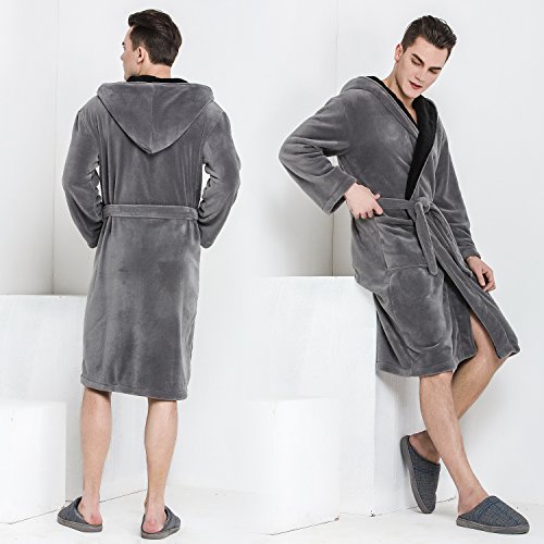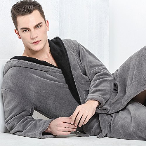 Hooded Herringbone Men's Grey Soft Spa Bathrobe with Black Kimono Shawl Collar, Large