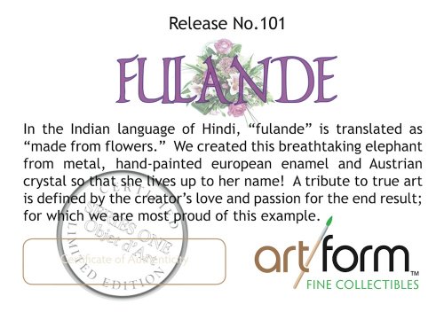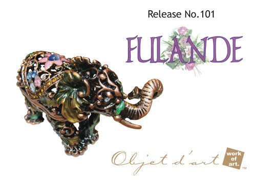 -. Binding : Misc. -. Brand : Objet d' Art -. EAN : 0845277000731 -. Feature : Made 100% by hand by expert metal handcrafters. / Beautifully boxed and includes certificate of authenticity, presentation gift card with matching envelope. / A beautiful, tasteful collectible. A gift worth giving and keeping for a lifetime. / Hand applied authentic Austrian crystal and European lacquers. / Part of the huge collection of jeweled trinket boxes from Artform Fine Collectibles. -. Label : Artform, LLC -. Manufacturer : Artform, LLC -. Model : THAF0979 -. MPN : THAF0979 -. PackageQuantity : 1 -. PartNumber : THAF0979 -. ProductGroup : Home -. ProductTypeName : HOME -. Publisher : Artform, LLC -. Studio : Artform, LLC -. Title : Objet D'Art Release #101 "Fulande" Filigree Antiqued Flowered Elephant Handmade Jeweled Enameled Metal Trinket Box -. UPC : 845277000731 -. Warranty : 90 day warranty against manufacturer defects