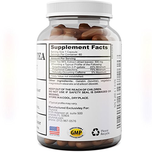 For herbal weight loss support, detox, brain function and energy, it's hard to beat pure and natural green tea extract. Packed with bioavailable antioxidants known as catechins, Green Tea Leaves are rich in cleansing ability as well as a long-time energy source for humans. With small amounts of trace minerals and lots of natural goodness, green tea tops the list of favorite superfoods-in Eastern traditions, and now in the Western world. Our formula is 98% pure Green Tea Extract and each bottle contains 60 capsules. The active antioxidant in green tea is called Epigallocatechin-3-P-gallate (we maintain a 45% Minimum.) It's an antioxidant polyphenol, known as EGCG. It contributes to detox, heart health and even inhibits DHT. Polyphenol Catechins (our formula contains a 75% Minimum) are flavanoids that promote all-over health. Naturally-Occurring Caffeine rounds out this supplement. A 5% Maximum ensures gentle metabolism, a fat burning boost, plus mental + brain support for better cognition + productivity. Try this high quality world-renown natural extract and let us know how it enhances your day and your life! We always guarantee your satisfaction, 100% and stand behind all of our products.Feature