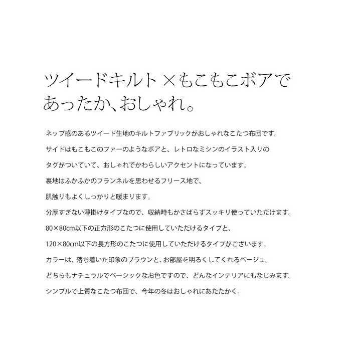원본상품명: 80×80cm天板?? こたつ布?「TWEED」正方形190cm×190cm ツイ?ドキルト×ボア おしゃれな薄掛けこたつ布? コタツカバ? シンプル北?おしゃれ送料無料ポイント5倍