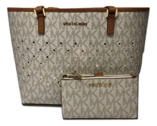 -. Feature : Bundle of 2 items: MICHAEL Women's Jet Set Travel SM Violet Carry All Tote and Jet Set Travel Double Zip Wallet Wristlet / Signature MK details in perforated leather with gold metal foil, Open Top style tote, logo on front / Interior : 1 main compartment, 4 slip pockets, 1 zip secure pocket. / Signature lining / Measures Approximately: 15"x10"x5" tote, and 7.25"x4.25"x1" Wallet Size