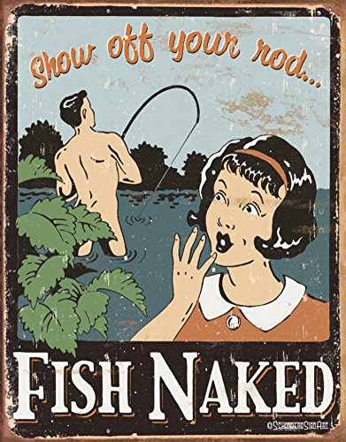 Fish Naked Show Off Your Rod Distressed Retro Vintage Tin Sign