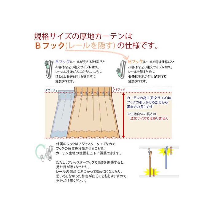 훅:adjusterB훅(레일을 감춘다)붙어⇒상부에 표시 높이 사이즈에는 포함되지 않는 원단이 약4cm 들(나)고 있고, 레일을 감추는 바와 같이(하도록) 걸립니다.천정부의 레일 등,상부에 스페이스가 없는 경우는 adjuster 훅을 조정해 심부름꾼 하실 수 있는(단 원단이 아래에 이동 하므로 높이 사이즈가 길게 됩니다).※상품 이미지는 레일을 보이는 바와 같이(하도록) 훅을 조정한 상태의 화상입니다.