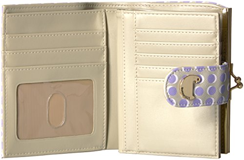 Custom Printed Faux Leather with Gold tone Logo Plaque/Hardware Dotty Dots Lexington Wallet features a 5" framed purse, double outside snap closure for expandability, 15 credit card slots, 8 storage pockets, bill compartment and I.D. window.