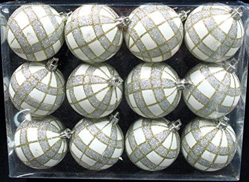 Queens of Christmas WL-ORN-12PK-PLD-GO 12 Pack Ball Ornament with Gold and Silver Plaid Design, White