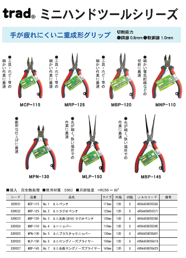 手が疲れにくい二重成形グリップのミニ先曲ロングノーズプライヤー。スプリング付で作業効率がよく細かな作業に最適。