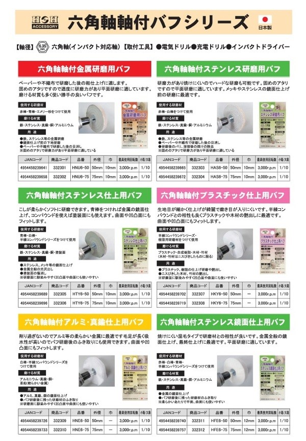 【商品名】(業務用5個セット) H&H 六角軸軸付きバフ/先端工具 【金属研磨用】 日本製 HNU6-50 〔DIY用品/大工道具〕
