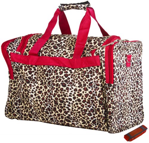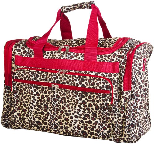 -. Brand : World Traveler -. ClothingSize : 19-inch -. Color : Leopard - Red -. Department : womens -. EAN : 0702472380085 -. Feature : Adjustable, detachable non-slip padded shoulder strap / Metal feet allows stabiity to bag when setting down and provides bag floor not to touch floor directly to get dirty / Front exterior zip pocket with two exterior end zip pockets / Silver pewter hardware -. Model : T19-168-R -. MPN : T19-168-R -. NumberOfItems : 1 -. PackageQuantity : 1 -. PartNumber : T19-168-R -. ProductGroup : Apparel -. ProductTypeName : LAGE -. Size : 19-inch -. Title : World Traveler Red Leopard Duffle Bag 19-inch -. UPC : 702472380085