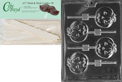 Cybrtrayd 45St50-H049 Medium Flat Pumpkin Lolly Halloween Chocolate Candy Mold with 50 Cybrtrayd 4.5-Inch Lollipop Sticks
